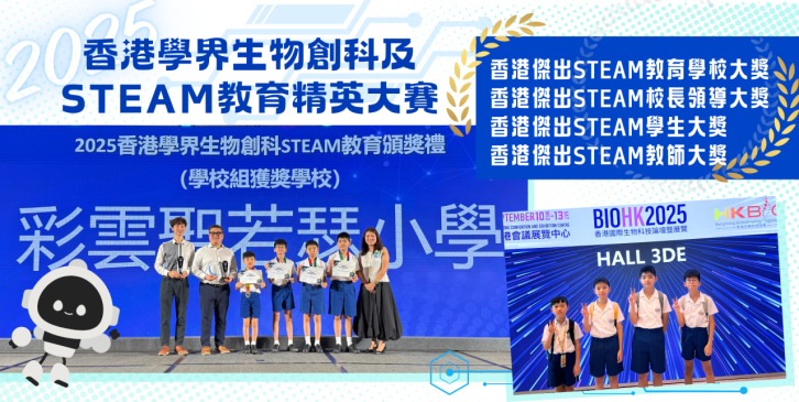 13/9/2025 | 5A 陳傲兒 5A 蕭文亮 6A 趙紹瑋 6D 李朗迪 6D 梁浩斌 | 香港學界⽣物創科及STEAM教育精英⼤賽 香港傑出STEAM學⽣ |