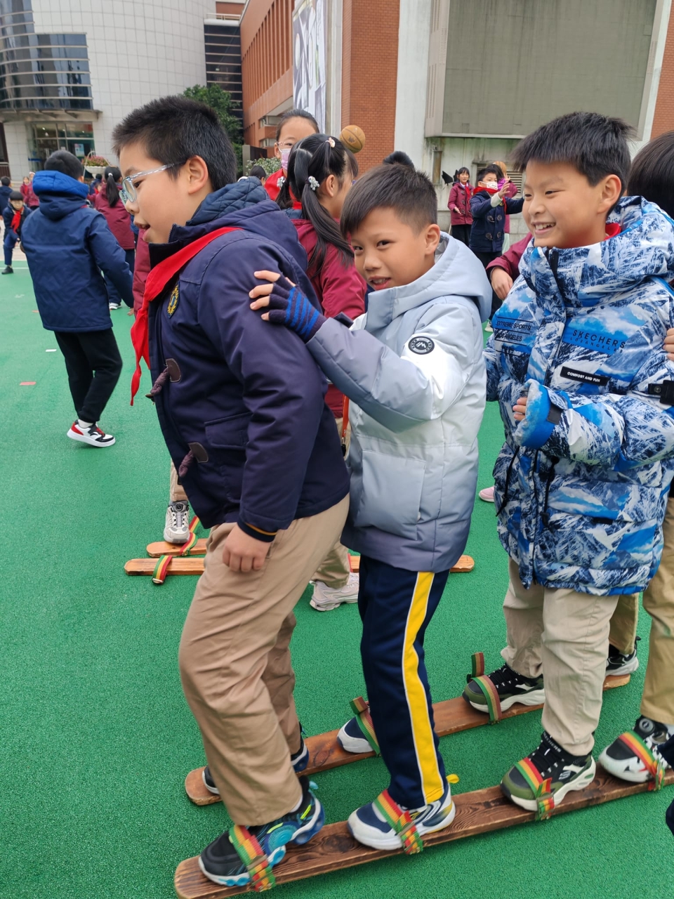 接下來是課間大活動,1000多人在偌大的操場上玩各種團體遊戲。我們玩了大腳八、跳大繩及傳球等活動,馬上跟二村啲同學熟絡起來!