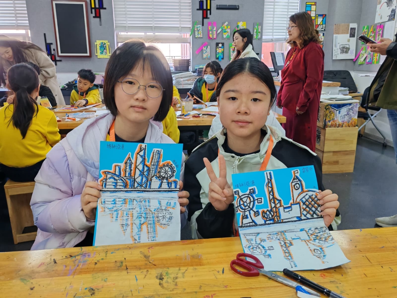 一開始,我們想到要形象化地畫出香港繁華的一面,一時不知從何下筆,可幸上海的老師一步一步教導我們從取材、分割景物、打線條、打陰影、沾水拓印,兩小時之後我們全都做出滿意的作品!真有滿足感!